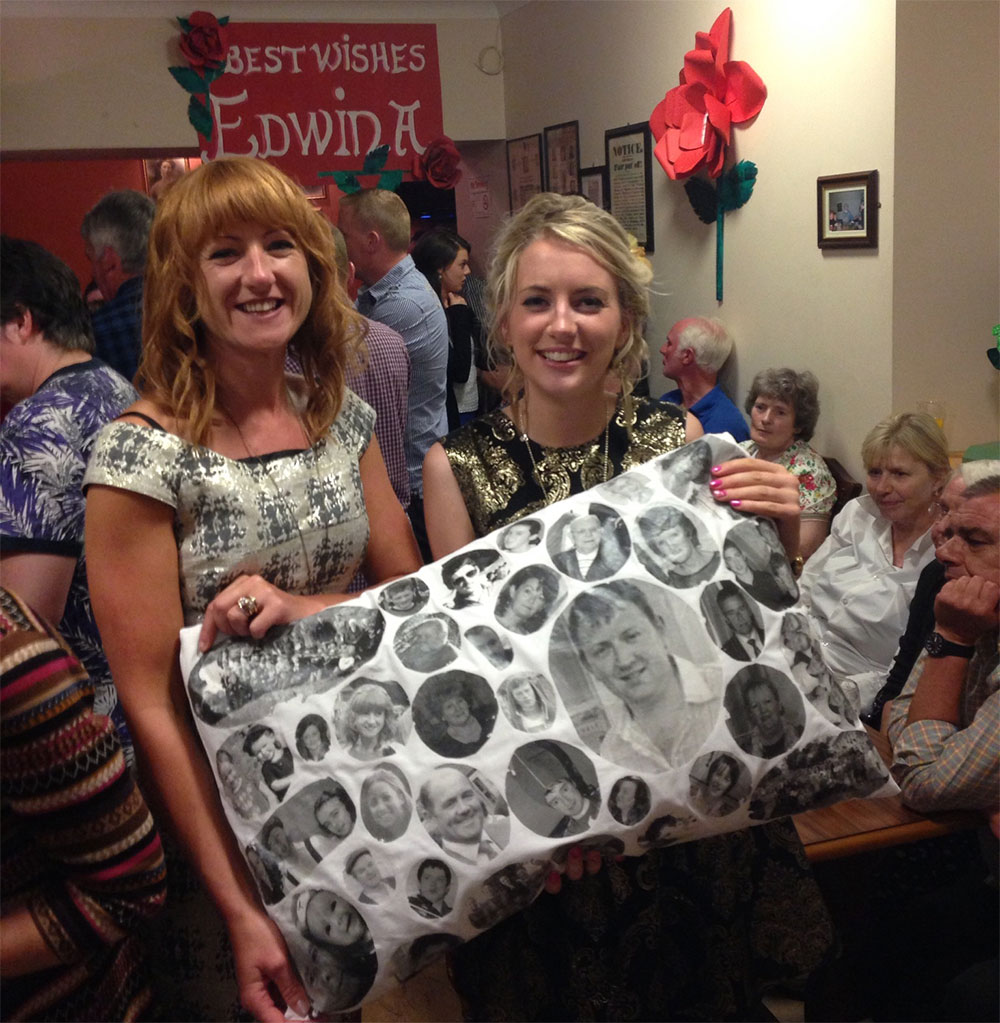 Delighted, as Chairperson of Drumsna Comhaltas to present Leitrim Rose Edwina Guckian (Secretary of Drumsna Comhaltas) with an alternative bouquet at Drumsna CCE’s special function for Edwina on Friday night. The “face pillow” was specially made, because Edwina has a busy, tiring time ahead and Drumsna CCE know they wont get to see her very much, with the committments and demands of the Rose of Tralee competition, over the coming weeks. Speaking at the presentation Sinead said “we wanted to give something practical to Edwina to help her in the contest, with the demands of the contest, we know she will be tired and we know we wont get to see as much of her. And we know she will miss us!. So we don’t want Edwina to be tired & we dont want her to be lonely as she heads off on her Rose of Tralee tour. So we came up with the idea of the Face pillow!” The pillowcase has been speically made with pictures of Edwina’s Comhaltas friends, family and proud community printed all over it. “So Edwina can take us with her, we hope the pillow brings her luck and helps make her dreams come true”
